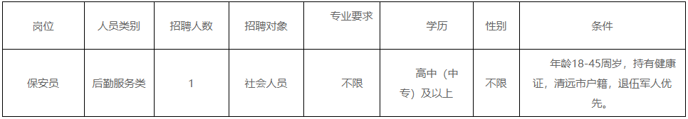 清遠(yuǎn)市清城區(qū)機(jī)關(guān)事務(wù)管理局因工作需要,根據(jù)《關(guān)于印發(fā)<清遠(yuǎn)市清城區(qū)機(jī)關(guān)事業(yè)單位專項(xiàng)工作聘員、合同制聘員以及后勤服務(wù)類人員管理辦法>的通知》(城區(qū)人社[2022]20號(hào))文件精神,面向社會(huì)公開招聘后勤服務(wù)類人員1名,現(xiàn)將有關(guān)事宜公告如下: