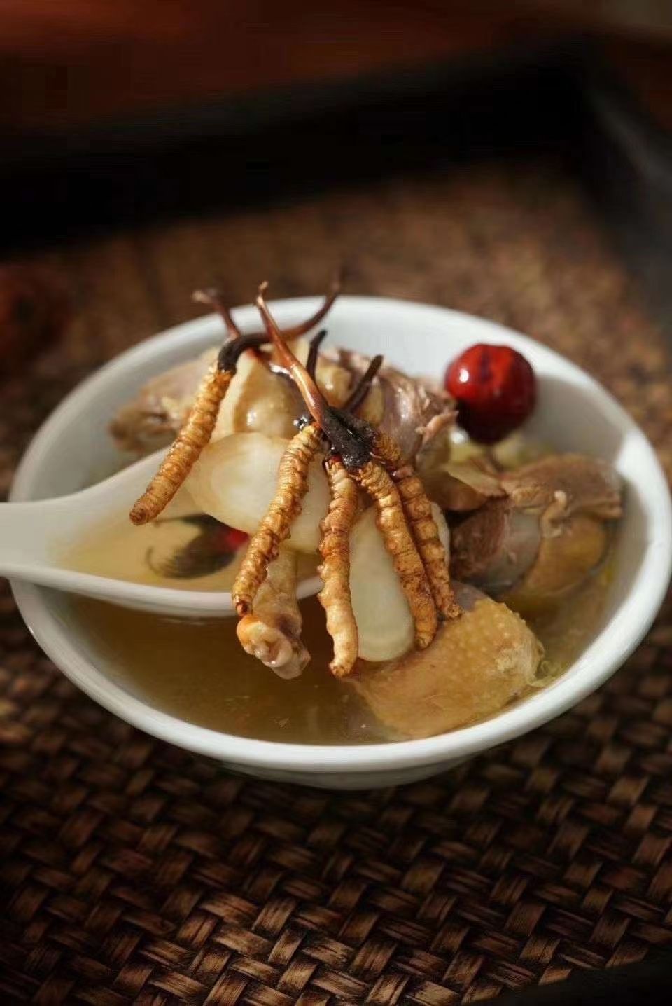注意事項(xiàng):鹿茸提前用黃酒浸泡20分鐘去除腥味,蟲草可以反復(fù)燉幾次,然后吃掉